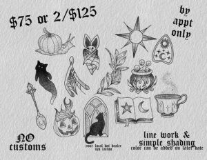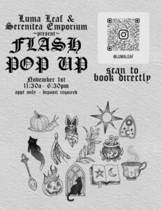 We are thrilled to announce the highly anticipated event at SereniTea Emporium, featuring Luma Leaf Tattoo. On November 1, from 11:30 am to 6 pm, we will host our inaugural 'Tarot and Tattoo' event, which we hope will be the first of many. This exclusive event requires appointments, with a $25 deposit to secure your spot. Tattoo prices are $75 for one or $125 for two, with a limit of two tattoos per person, restricted to arms and legs only. Color additions can be made at a later date at the studio. Choose from 13 unique flash designs (1-2 inches, no modifications). Additionally, we are offering a special tarot reading sale for $40 (30 minutes), with an extra $5 discount for those booking a tattoo appointment. Furthermore, we will have a sale on all our tarot and oracle cards. Book your appointment using the QR code below, as spots are limited and available on a first-come, first-served basis.