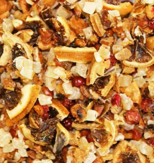 Ingredients: Pineapple cubes (pineapple, sugar), apple, lemon granulate (glucose syrup, lemon juice concentrate, sugared apricots, starch, thickener), lemon, natural flavor, red currants