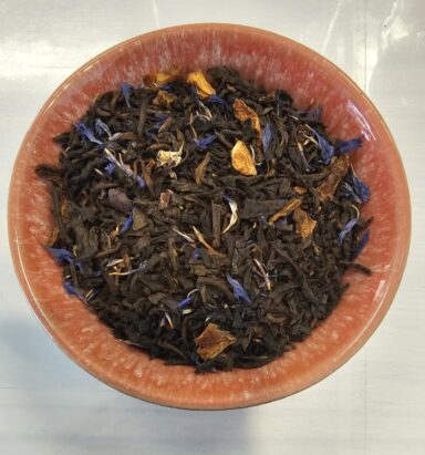 Ingredients: Pu Erh Tea, Orange, Cocoa nibs, natural chocolate flavor, blue cornflowers, natural orange flavor